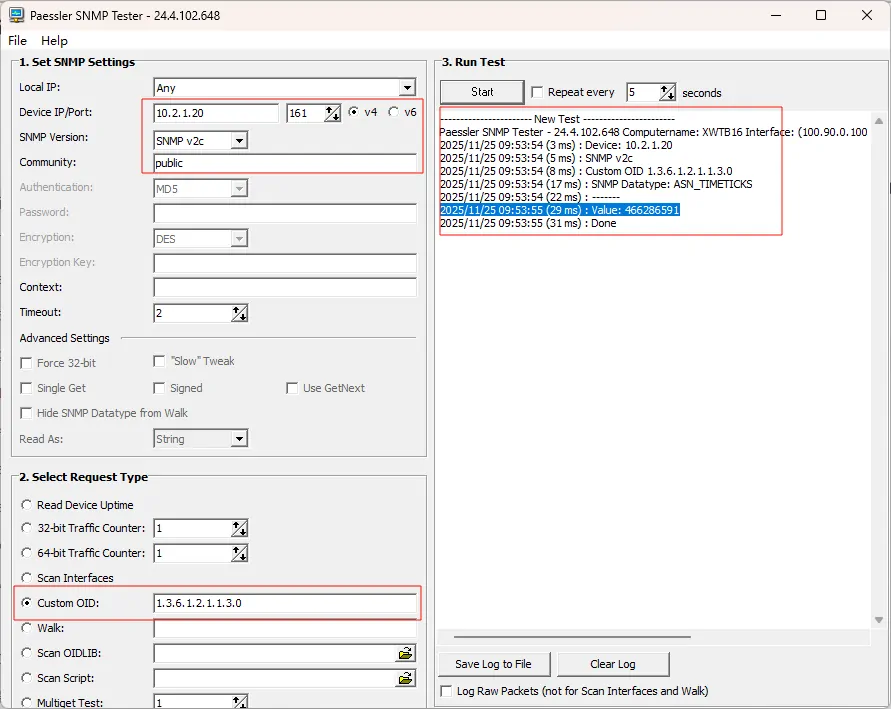 配置完成保存后,可以先提前测试一下设备是否正常响应SNMP请求,我这里使用Paessler SNMP Tester