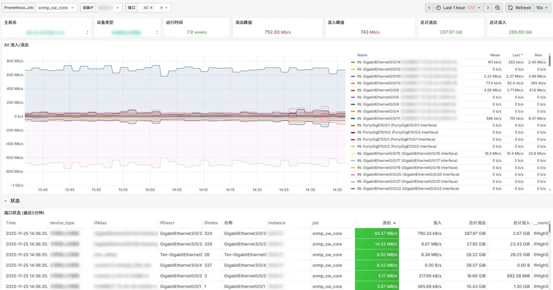 对于接口和设备粒度下的流量监控,有成熟的SNMP协议,对于Prometheus+Grafana生态来说,SNMP Exporter可以很好地采集这些指标。