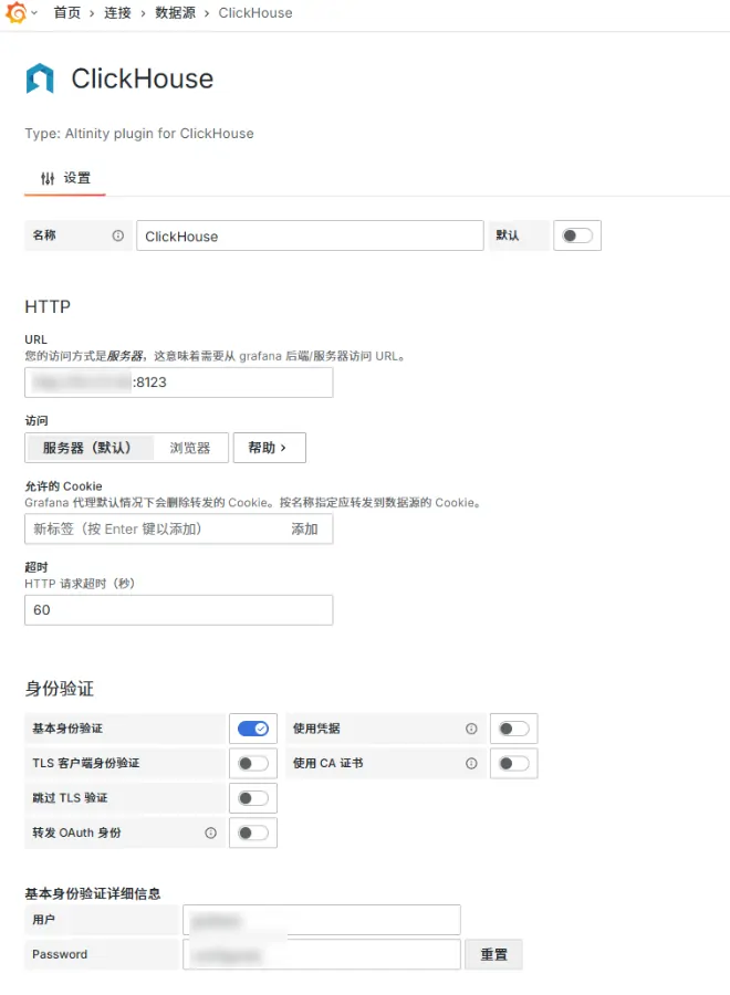 对于SNMP,Grafana可以从Prometheus直接获取数据,对于sFlow,需要对Grafana安装ClickHouse数据源插件,这里使用Altinity plugin for ClickHouse,安装后直接添加数据源即可: