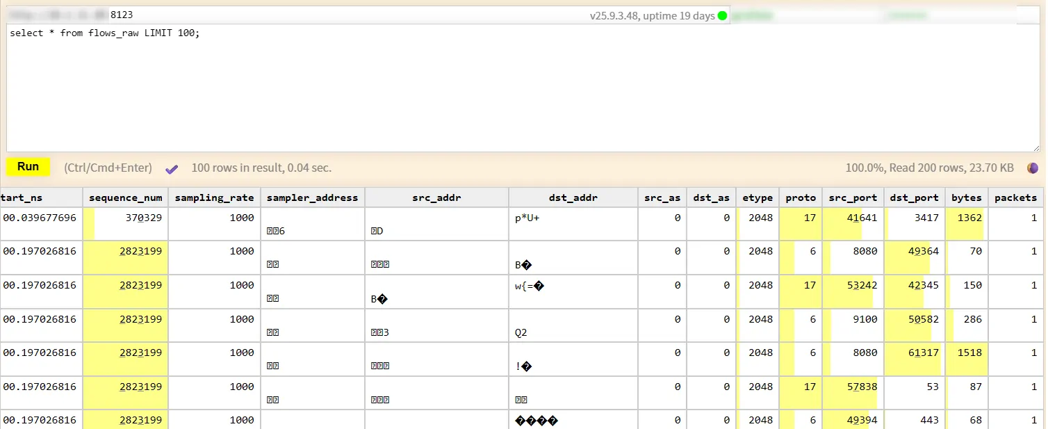 顺带一提,如果你要在ClickHouse中直接查询IP相关的列,你会得到乱码: