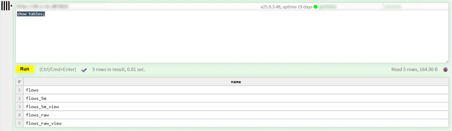 运行后可以通过http://:8123进入ClickHouse自带的一个管理界面,可以通过Web SQL UI连接到实例,并查看初始化脚本是否应用成功: