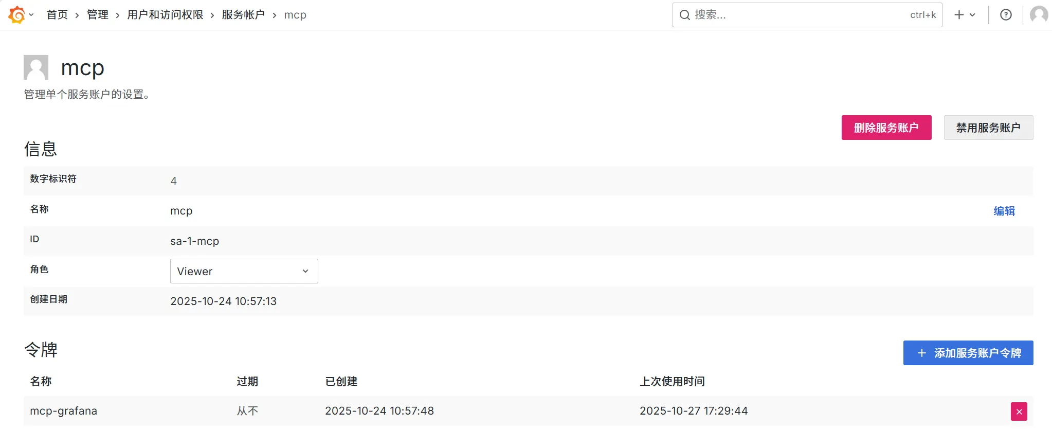 创建服务账户后,需要为该账户生成一个API Token,用于MCP服务器与Grafana API的认证。