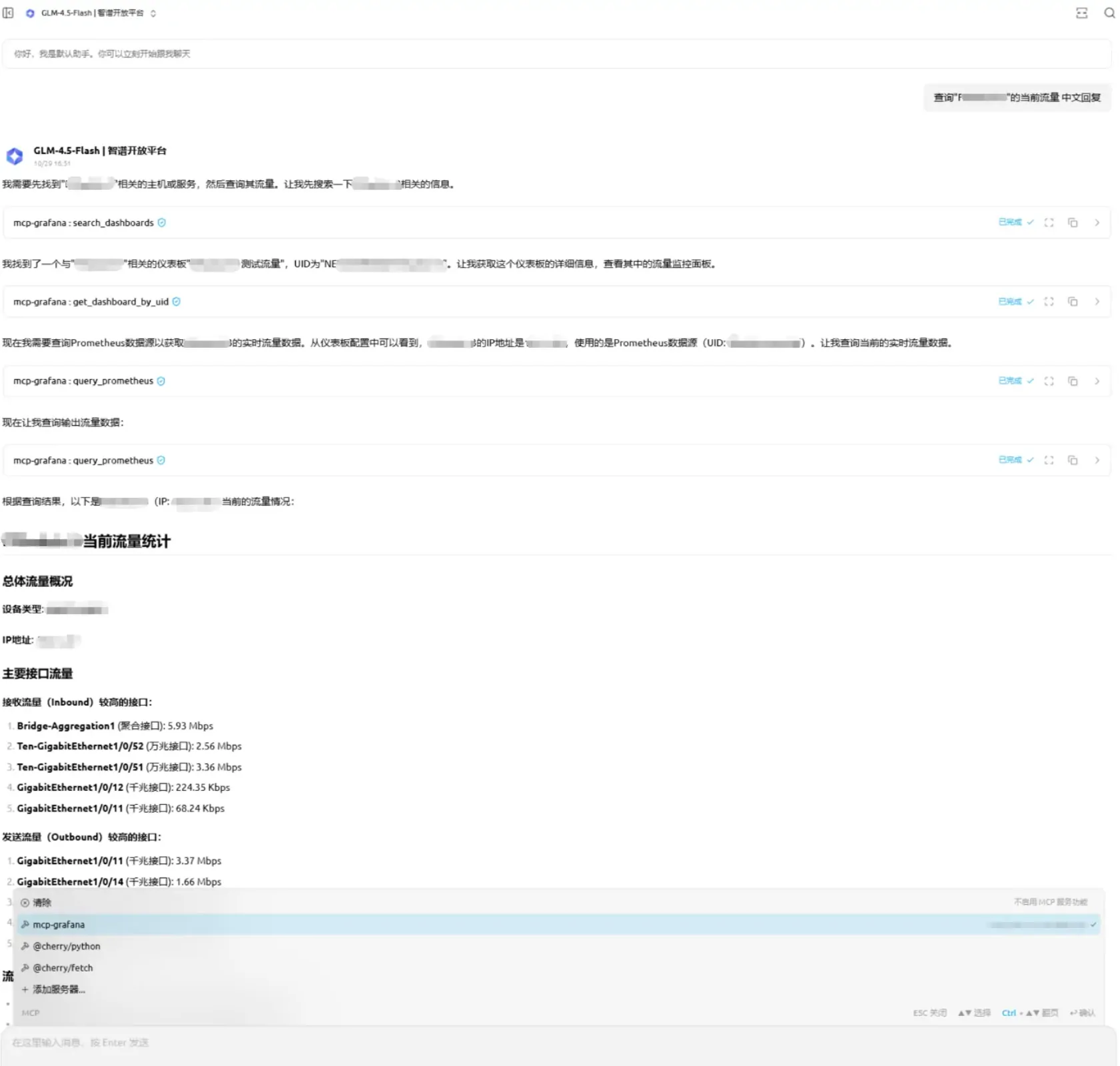 拿智谱清言的产品GLM-4.5-Flash执行一个简单的Prompt测试,查一台交换机的当前流量: