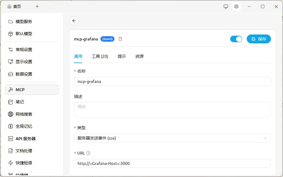 至此,MCP-Grafana服务器已经部署完成,接下来就可以使用支持MCP协议的客户端进行测试了。这里以CherryStudio为例,大同小异。